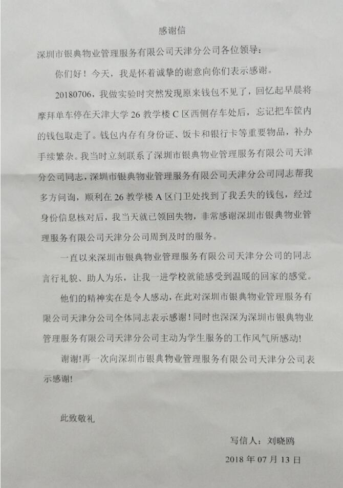 該名學(xué)生在核實(shí)身份后,順利取得錢包,且檢查重要證件未被遺失。由此為對我司工作人員的樂于助人、工作細(xì)致、服務(wù)周到的品質(zhì)表示由衷的感謝,特贈予我處錦旗一面,感謝信一封。(詳見附圖)