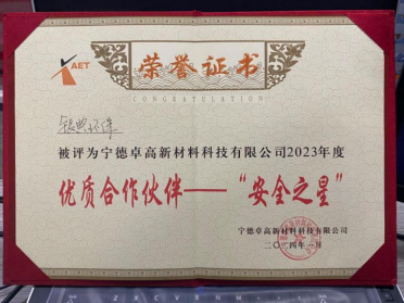 寧德銀典環(huán)保工程公司,在2024年1月29日這個值得紀念的日子里,榮獲了寧德卓高新材料科技有限公司頒發(fā)的“2023年度優(yōu)質(zhì)合伙人”稱號,并被授予《安全之星》榮譽。這不僅是對我們12年來在環(huán)保設施運維服務領域深耕不懈的肯定,也是對我們團隊高度安全意識和專業(yè)管理能力的認可。